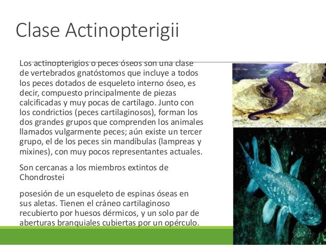 11. 11. Clase Actinopterigii Los actinopterigios o peces óseos son una clase de vertebrados gnatóstomos que incluye a todos los peces dotados de esqueleto interno óseo, es decir, compuesto principalmente de piezas calcificadas y muy pocas de cartílago. Junto con los condrictios (peces cartilaginosos), forman los dos grandes grupos que comprenden los animales llamados vulgarmente peces; aún existe un tercer grupo, el de los peces sin mandíbulas (lampreas y mixines), con muy pocos representantes actuales. Son cercanas a los miembros extintos de Chondrostei posesión de un esqueleto de espinas óseas en sus aletas. Tienen el cráneo cartilaginoso recubierto por huesos dérmicos, y un solo par de aberturas branquiales cubiertas por un opérculo.