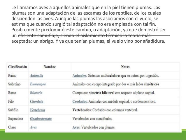 13. 13. Le llamamos aves a aquellos animales que en la piel tienen plumas. Las plumas son una adaptación de las escamas de los reptiles, de los cuales descienden las aves. Aunque las plumas las asociamos con el vuelo, se estima que cuando surgió tal adaptación no era empleada con tal fin. Posiblemente predominó este cambio, o adaptación, ya que demostró ser un eficiente camuflaje, siendo el aislamiento térmico la teoría más aceptada; un abrigo. Y ya que tenían plumas, el vuelo vino por añadidura.