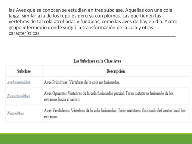 14. 14. las Aves que se conocen se estudian en tres subclase. Aquellas con una cola larga, similar a la de los reptiles pero ya con plumas. Las que tienen las vértebras de tal cola atrofiadas y fundidas, como las aves de hoy en día. Y otro grupo intermedio donde surgió la transformación de la cola y otras características