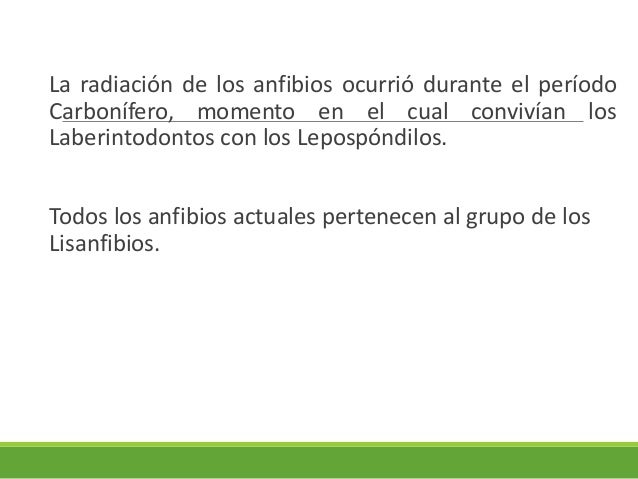 16. 16. La radiación de los anfibios ocurrió durante el período Carbonífero, momento en el cual convivían los Laberintodontos con los Lepospóndilos. Todos los anfibios actuales pertenecen al grupo de los Lisanfibios.