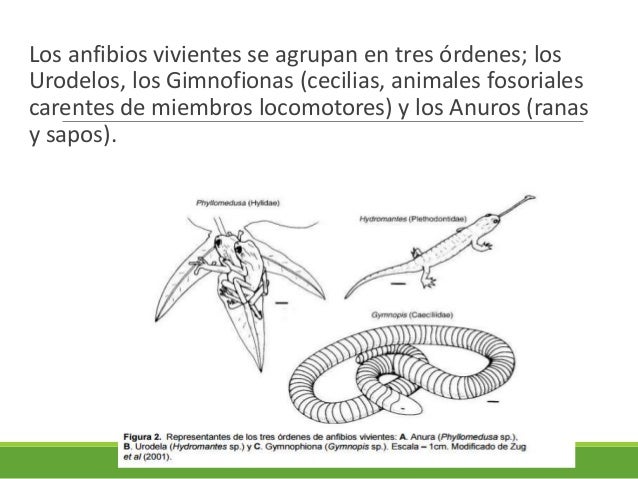 17. 17. Los anfibios vivientes se agrupan en tres órdenes; los Urodelos, los Gimnofionas (cecilias, animales fosoriales carentes de miembros locomotores) y los Anuros (ranas y sapos).