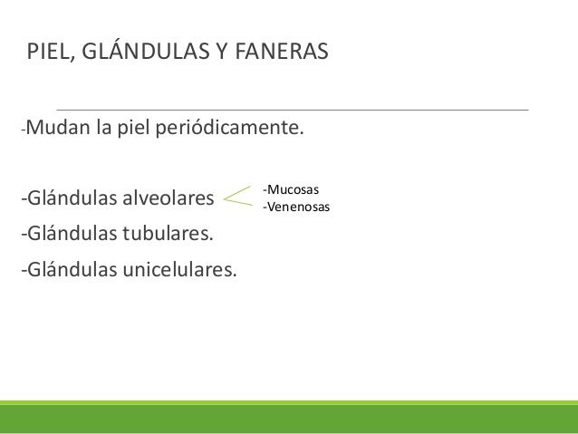 18. 18. PIEL, GLÁNDULAS Y FANERAS -Mudan la piel periódicamente. -Glándulas alveolares -Glándulas tubulares. -Glándulas unicelulares. -Mucosas -Venenosas