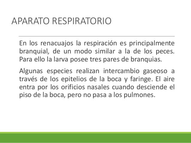 19. 19. APARATO RESPIRATORIO En los renacuajos la respiración es principalmente branquial, de un modo similar a la de los peces. Para ello la larva posee tres pares de branquias. Algunas especies realizan intercambio gaseoso a través de los epitelios de la boca y faringe. El aire entra por los orificios nasales cuando desciende el piso de la boca, pero no pasa a los pulmones.