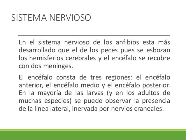 21. 21. SISTEMA NERVIOSO En el sistema nervioso de los anfibios esta más desarrollado que el de los peces pues se esbozan los hemisferios cerebrales y el encéfalo se recubre con dos meninges. El encéfalo consta de tres regiones: el encéfalo anterior, el encéfalo medio y el encéfalo posterior. En la mayoría de las larvas (y en los adultos de muchas especies) se puede observar la presencia de la línea lateral, inervada por nervios craneales.