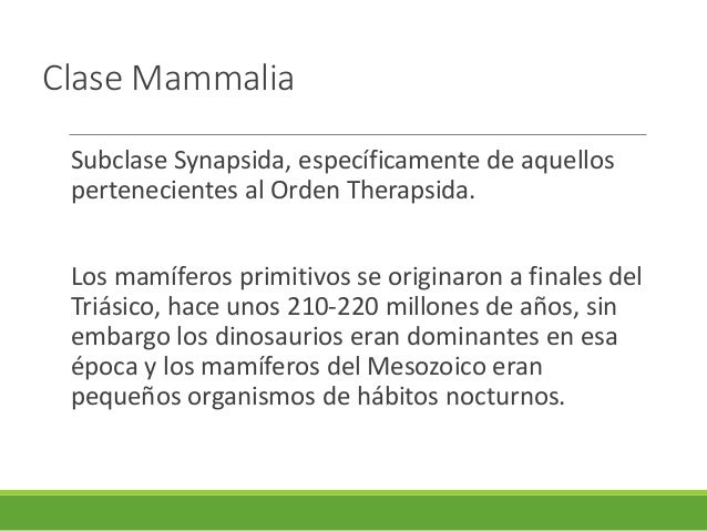 22. 22. Clase Mammalia Subclase Synapsida, específicamente de aquellos pertenecientes al Orden Therapsida. Los mamíferos primitivos se originaron a finales del Triásico, hace unos 210-220 millones de años, sin embargo los dinosaurios eran dominantes en esa época y los mamíferos del Mesozoico eran pequeños organismos de hábitos nocturnos.