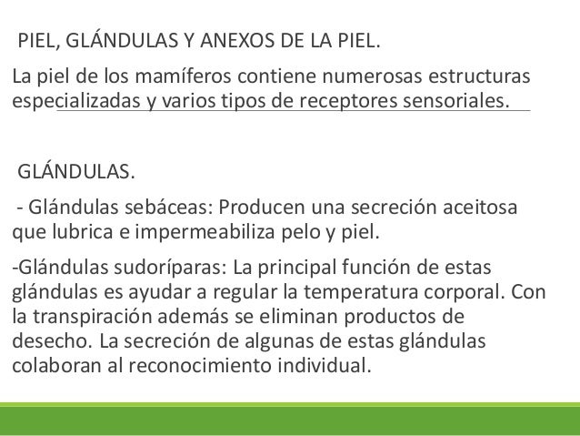 24. 24. PIEL, GLÁNDULAS Y ANEXOS DE LA PIEL. La piel de los mamíferos contiene numerosas estructuras especializadas y varios tipos de receptores sensoriales. GLÁNDULAS. - Glándulas sebáceas: Producen una secreción aceitosa que lubrica e impermeabiliza pelo y piel. -Glándulas sudoríparas: La principal función de estas glándulas es ayudar a regular la temperatura corporal. Con la transpiración además se eliminan productos de desecho. La secreción de algunas de estas glándulas colaboran al reconocimiento individual.