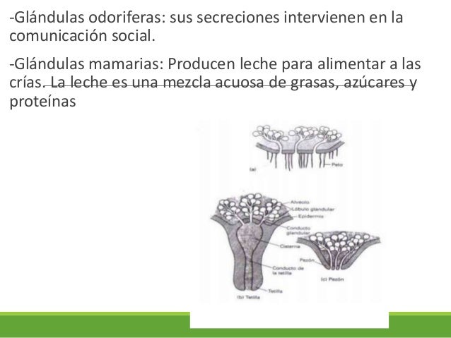 25. 25. -Glándulas odoriferas: sus secreciones intervienen en la comunicación social. -Glándulas mamarias: Producen leche para alimentar a las crías. La leche es una mezcla acuosa de grasas, azúcares y proteínas