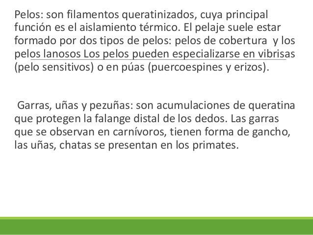 26. 26. Pelos: son filamentos queratinizados, cuya principal función es el aislamiento térmico. El pelaje suele estar formado por dos tipos de pelos: pelos de cobertura y los pelos lanosos Los pelos pueden especializarse en vibrisas (pelo sensitivos) o en púas (puercoespines y erizos). Garras, uñas y pezuñas: son acumulaciones de queratina que protegen la falange distal de los dedos. Las garras que se observan en carnívoros, tienen forma de gancho, las uñas, chatas se presentan en los primates.