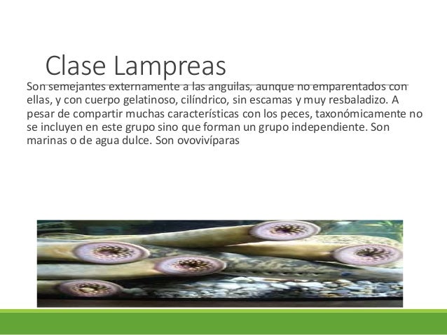 3. 3. Clase Lampreas Son semejantes externamente a las anguilas, aunque no emparentados con ellas, y con cuerpo gelatinoso, cilíndrico, sin escamas y muy resbaladizo. A pesar de compartir muchas características con los peces, taxonómicamente no se incluyen en este grupo sino que forman un grupo independiente. Son marinas o de agua dulce. Son ovovivíparas