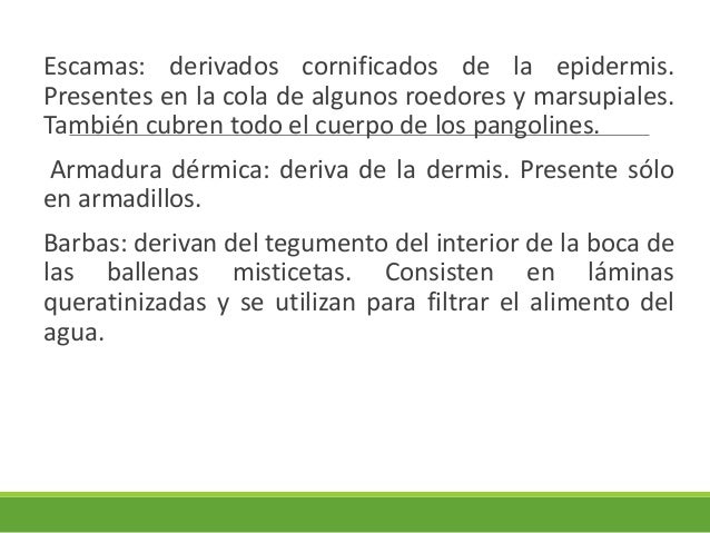 27. 27. Escamas: derivados cornificados de la epidermis. Presentes en la cola de algunos roedores y marsupiales. También cubren todo el cuerpo de los pangolines. Armadura dérmica: deriva de la dermis. Presente sólo en armadillos. Barbas: derivan del tegumento del interior de la boca de las ballenas misticetas. Consisten en láminas queratinizadas y se utilizan para filtrar el alimento del agua.