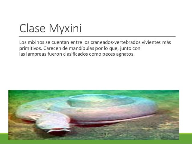 4. 4. Clase Myxini Los mixinos se cuentan entre los craneados-vertebrados vivientes más primitivos. Carecen de mandíbulas por lo que, junto con las lampreas fueron clasificados como peces agnatos.