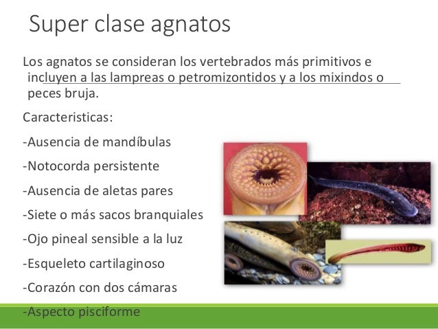 5. 5. Super clase agnatos Los agnatos se consideran los vertebrados más primitivos e incluyen a las lampreas o petromizontidos y a los mixindos o peces bruja. Caracteristicas: -Ausencia de mandíbulas -Notocorda persistente -Ausencia de aletas pares -Siete o más sacos branquiales -Ojo pineal sensible a la luz -Esqueleto cartilaginoso -Corazón con dos cámaras -Aspecto pisciforme
