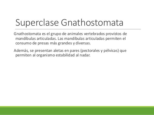 6. 6. Superclase Gnathostomata Gnathostomata es el grupo de animales vertebrados provistos de mandíbulas articuladas. Las mandíbulas articuladas permiten el consumo de presas más grandes y diversas. Además, se presentan aletas en pares (pectorales y pélvicas) que permiten al organismo estabilidad al nadar.