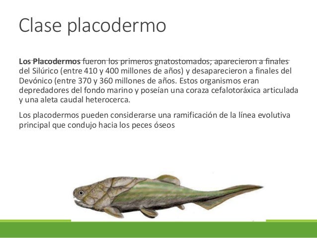 7. 7. Clase placodermo Los Placodermos fueron los primeros gnatostomados; aparecieron a finales del Silúrico (entre 410 y 400 millones de años) y desaparecieron a finales del Devónico (entre 370 y 360 millones de años. Estos organismos eran depredadores del fondo marino y poseían una coraza cefalotoráxica articulada y una aleta caudal heterocerca. Los placodermos pueden considerarse una ramificación de la línea evolutiva principal que condujo hacia los peces óseos