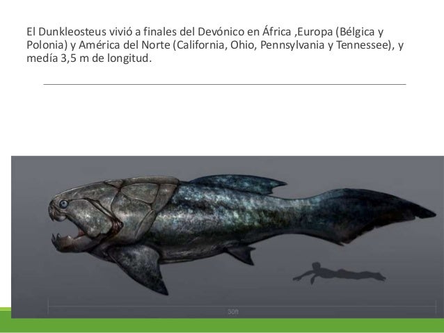 8. 8. El Dunkleosteus vivió a finales del Devónico en África ,Europa (Bélgica y Polonia) y América del Norte (California, Ohio, Pennsylvania y Tennessee), y medía 3,5 m de longitud.