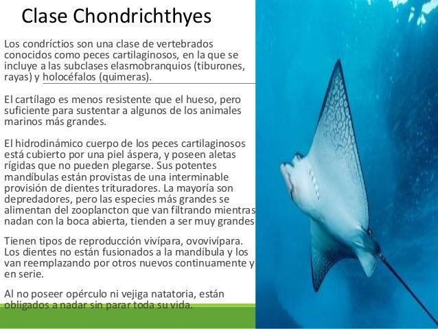 9. 9. Los condríctios son una clase de vertebrados conocidos como peces cartilaginosos, en la que se incluye a las subclases elasmobranquios (tiburones, rayas) y holocéfalos (quimeras). El cartílago es menos resistente que el hueso, pero suficiente para sustentar a algunos de los animales marinos más grandes. El hidrodinámico cuerpo de los peces cartilaginosos está cubierto por una piel áspera, y poseen aletas rígidas que no pueden plegarse. Sus potentes mandíbulas están provistas de una interminable provisión de dientes trituradores. La mayoría son depredadores, pero las especies más grandes se alimentan del zooplancton que van filtrando mientras nadan con la boca abierta, tienden a ser muy grandes Tienen tipos de reproducción vivípara, ovovivípara. Los dientes no están fusionados a la mandíbula y los van reemplazando por otros nuevos continuamente y en serie. Al no poseer opérculo ni vejiga natatoria, están obligados a nadar sin parar toda su vida. Clase Chondrichthyes