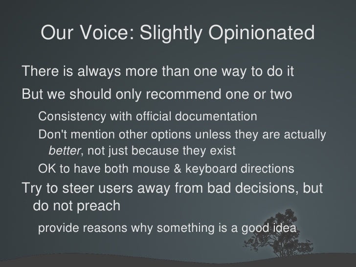 42. 42. Our Voice: Slightly Opinionated <ul><li>There is always more than one way to do it