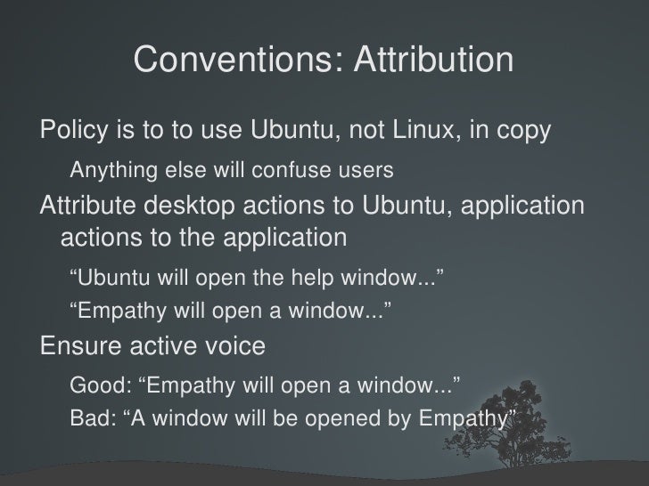 47. 47. Conventions: Attribution <ul><li>Policy is to to use Ubuntu, not Linux, in copy </li><ul><li>Anything else will confuse users </li></ul><li>Attribute desktop actions to Ubuntu, application actions to the application </li><ul><li>“Ubuntu will open the help window...”