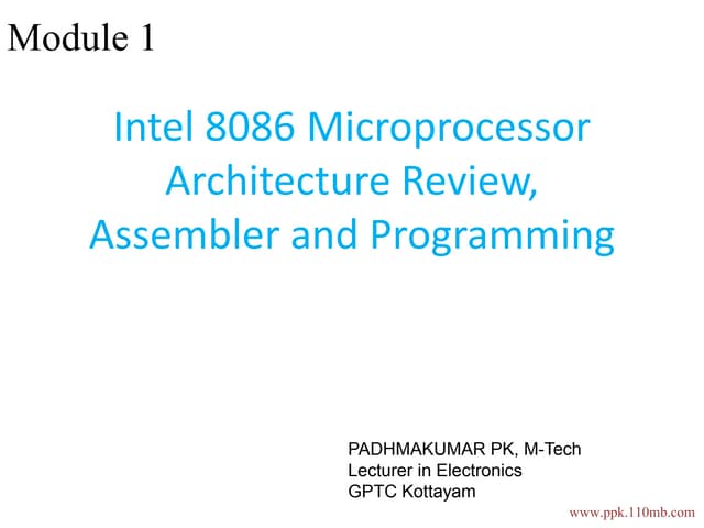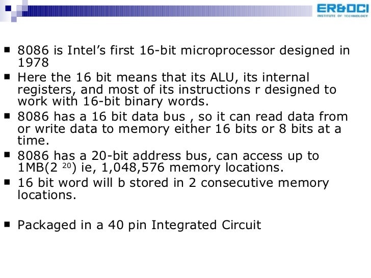 17. 17. <ul><li>8086 is Intel’s first 16-bit microprocessor designed in 1978 </li></ul><ul><li>Here the 16 bit means that its ALU, its internal registers, and most of its instructions r designed to work with 16-bit binary words. </li></ul><ul><li>8086 has a 16 bit data bus , so it can read data from or write data to memory either 16 bits or 8 bits at a time. </li></ul><ul><li>8086 has a 20-bit address bus, can access up to 1MB(2 20 ) ie, 1,048,576 memory locations. </li></ul><ul><li>16 bit word will b stored in 2 consecutive memory locations. </li></ul><ul><li>Packaged in a 40 pin Integrated Circuit </li></ul>