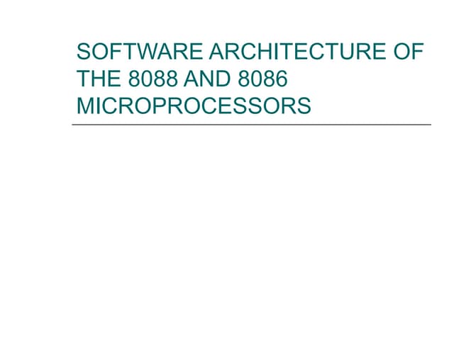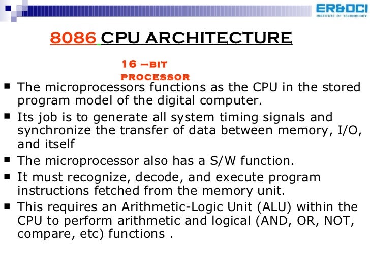 16. 16. 8086 CPU ARCHITECTURE <ul><li>The microprocessors functions as the CPU in the stored program model of the digital computer. </li></ul><ul><li>Its job is to generate all system timing signals and synchronize the transfer of data between memory, I/O, and itself </li></ul><ul><li>The microprocessor also has a S/W function. </li></ul><ul><li>It must recognize, decode, and execute program instructions fetched from the memory unit. </li></ul><ul><li>This requires an Arithmetic-Logic Unit (ALU) within the CPU to perform arithmetic and logical (AND, OR, NOT, compare, etc) functions . </li></ul>16 –bit processor