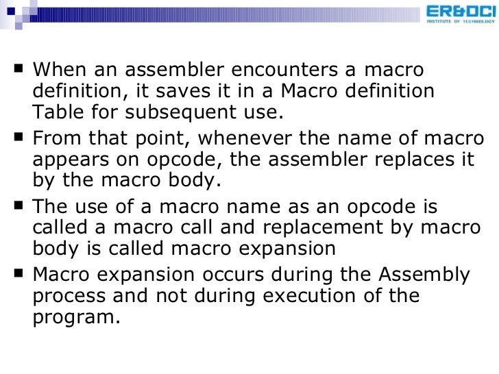 97. 100. <ul><li>When an assembler encounters a macro definition, it saves it in a Macro definition Table for subsequent use. </li></ul><ul><li>From that point, whenever the name of macro appears on opcode, the assembler replaces it by the macro body. </li></ul><ul><li>The use of a macro name as an opcode is called a macro call and replacement by macro body is called macro expansion </li></ul><ul><li>Macro expansion occurs during the Assembly process and not during execution of the program. </li></ul>
