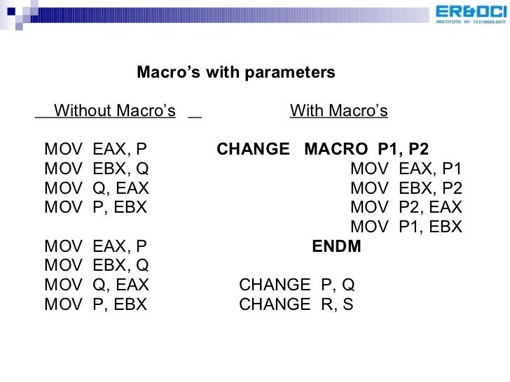 98. 101. <ul><li>Macro’s with parameters </li></ul><ul><li>Without Macro’s With Macro’s </li></ul><ul><li>MOV EAX, P CHANGE MACRO P1, P2 </li></ul><ul><li>MOV EBX, Q MOV EAX, P1 </li></ul><ul><li>MOV Q, EAX MOV EBX, P2 </li></ul><ul><li>MOV P, EBX MOV P2, EAX </li></ul><ul><li> MOV P1, EBX </li></ul><ul><li>MOV EAX, P ENDM </li></ul><ul><li>MOV EBX, Q </li></ul><ul><li>MOV Q, EAX CHANGE P, Q </li></ul><ul><li>MOV P, EBX CHANGE R, S </li></ul>