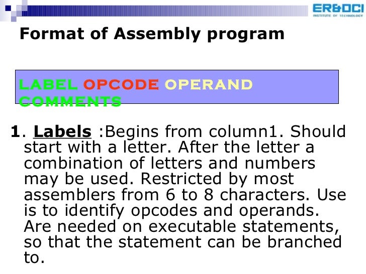 13. 13. <ul><li>1 . Labels :Begins from column1. Should start with a letter. After the letter a combination of letters and numbers may be used. Restricted by most assemblers from 6 to 8 characters. Use is to identify opcodes and operands. Are needed on executable statements, so that the statement can be branched to. </li></ul>Format of Assembly program LABEL OPCODE OPERAND COMMENTS