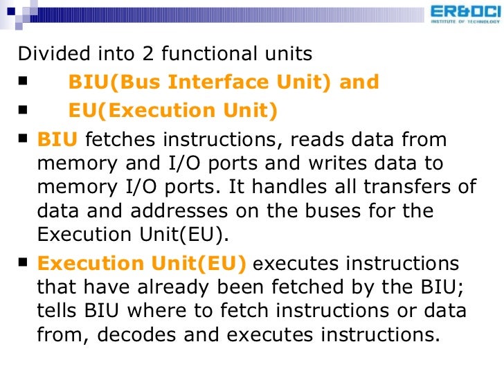 19. 19. <ul><li>Divided into 2 functional units </li></ul><ul><li>BIU(Bus Interface Unit) and </li></ul><ul><li>EU(Execution Unit) </li></ul><ul><li>BIU fetches instructions, reads data from memory and I/O ports and writes data to memory I/O ports. It handles all transfers of data and addresses on the buses for the Execution Unit(EU). </li></ul><ul><li>Execution Unit(EU) e xecutes instructions that have already been fetched by the BIU; tells BIU where to fetch instructions or data from, decodes and executes instructions. </li></ul>
