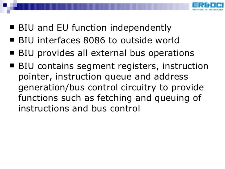 20. 20. <ul><li>BIU and EU function independently </li></ul><ul><li>BIU interfaces 8086 to outside world </li></ul><ul><li>BIU provides all external bus operations </li></ul><ul><li>BIU contains segment registers, instruction pointer, instruction queue and address generation/bus control circuitry to provide functions such as fetching and queuing of instructions and bus control </li></ul>