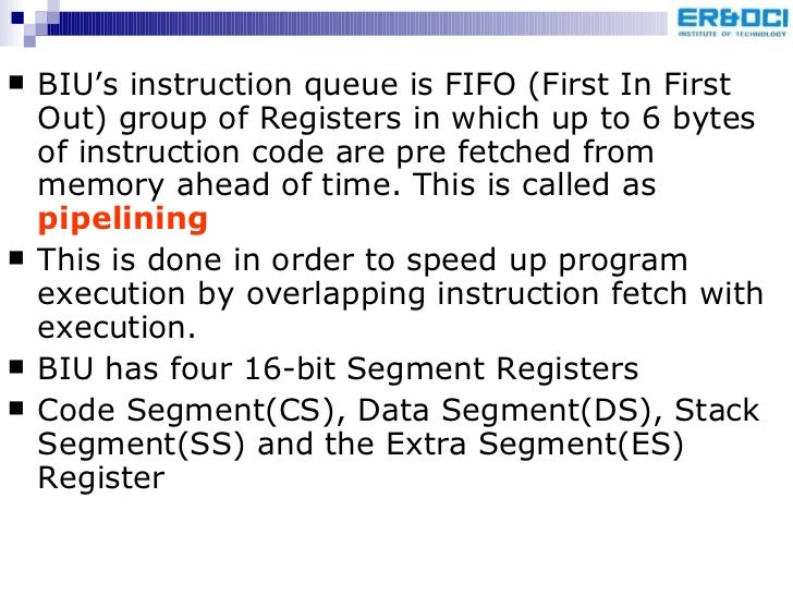21. 21. <ul><li>BIU’s instruction queue is FIFO (First In First Out) group of Registers in which up to 6 bytes of instruction code are pre fetched from memory ahead of time. This is called as pipelining </li></ul><ul><li>This is done in order to speed up program execution by overlapping instruction fetch with execution. </li></ul><ul><li>BIU has four 16-bit Segment Registers </li></ul><ul><li>Code Segment(CS), Data Segment(DS), Stack Segment(SS) and the Extra Segment(ES) Register </li></ul>