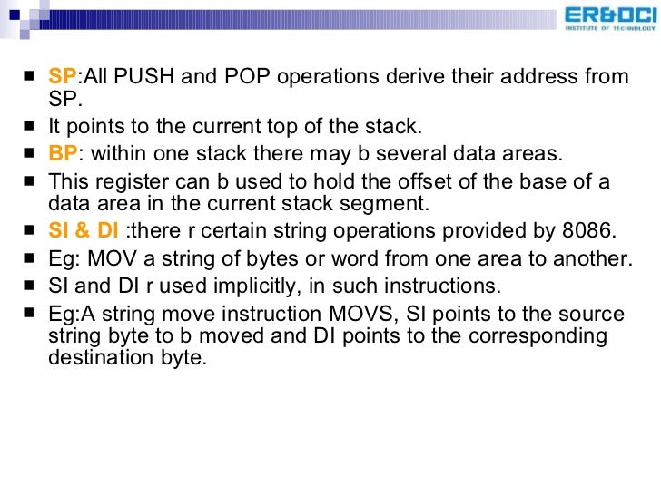 23. 26. <ul><li>SP :All PUSH and POP operations derive their address from SP. </li></ul><ul><li>It points to the current top of the stack. </li></ul><ul><li>BP : within one stack there may b several data areas. </li></ul><ul><li>This register can b used to hold the offset of the base of a data area in the current stack segment. </li></ul><ul><li>SI & DI :there r certain string operations provided by 8086. </li></ul><ul><li>Eg: MOV a string of bytes or word from one area to another. </li></ul><ul><li>SI and DI r used implicitly, in such instructions. </li></ul><ul><li>Eg:A string move instruction MOVS, SI points to the source string byte to b moved and DI points to the corresponding destination byte. </li></ul>