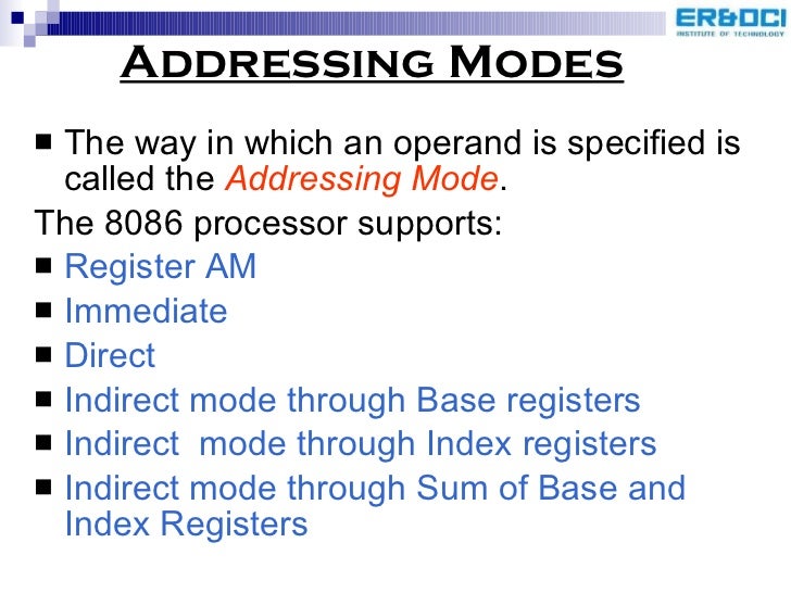 31. 34. Addressing Modes <ul><li>The way in which an operand is specified is called the Addressing Mode . </li></ul><ul><li>The 8086 processor supports: </li></ul><ul><li>Register AM </li></ul><ul><li>Immediate </li></ul><ul><li>Direct </li></ul><ul><li>Indirect mode through Base registers </li></ul><ul><li>Indirect mode through Index registers </li></ul><ul><li>Indirect mode through Sum of Base and Index Registers </li></ul>
