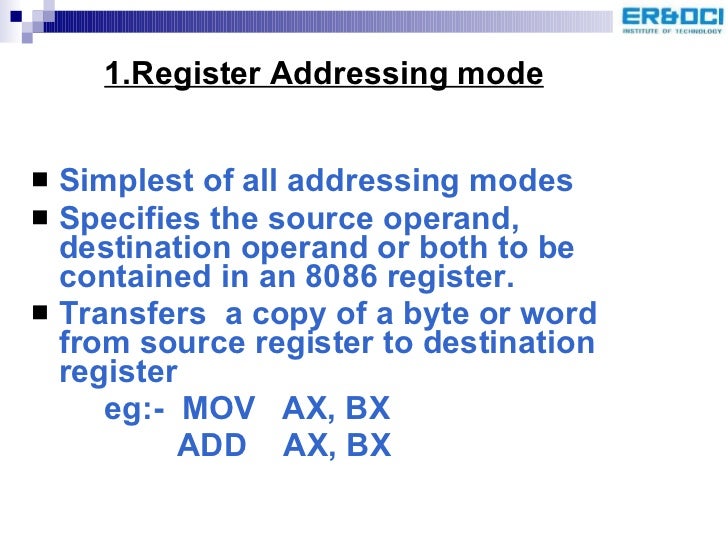 33. 36. <ul><li>Simplest of all addressing modes </li></ul><ul><li>Specifies the source operand, destination operand or both to be contained in an 8086 register. </li></ul><ul><li>Transfers a copy of a byte or word from source register to destination register </li></ul><ul><li>eg:- MOV AX, BX </li></ul><ul><li>ADD AX, BX </li></ul>1.Register Addressing mode