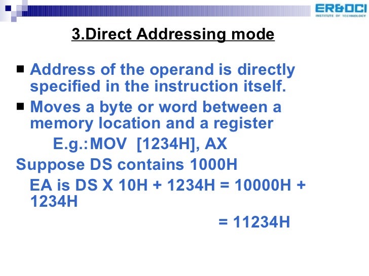 35. 38. 3.Direct Addressing mode <ul><li>Address of the operand is directly specified in the instruction itself. </li></ul><ul><li>Moves a byte or word between a memory location and a register </li></ul><ul><li>E.g.: MOV [1234H], AX </li></ul><ul><li>Suppose DS contains 1000H </li></ul><ul><li>EA is DS X 10H + 1234H = 10000H + 1234H </li></ul><ul><li> = 11234H </li></ul>