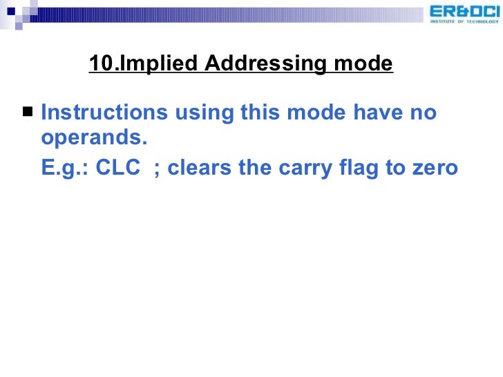 39. 42. 10.Implied Addressing mode <ul><li>Instructions using this mode have no operands. </li></ul><ul><li>E.g.: CLC ; clears the carry flag to zero </li></ul>