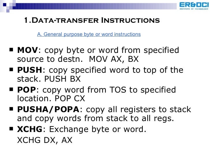 41. 44. 1.Data-transfer Instructions <ul><li>MOV : copy byte or word from specified source to destn. MOV AX, BX </li></ul><ul><li>PUSH : copy specified word to top of the stack. PUSH BX </li></ul><ul><li>POP : copy word from TOS to specified location. POP CX </li></ul><ul><li>PUSHA/POPA : copy all registers to stack and copy words from stack to all regs. </li></ul><ul><li>XCHG : Exchange byte or word. </li></ul><ul><li>XCHG DX, AX </li></ul>A. General purpose byte or word instructions