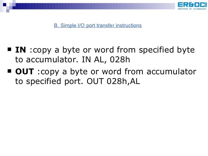 42. 45. <ul><li>IN :copy a byte or word from specified byte to accumulator. IN AL, 028h </li></ul><ul><li>OUT :copy a byte or word from accumulator to specified port. OUT 028h,AL </li></ul>B. Simple I/O port transfer instructions