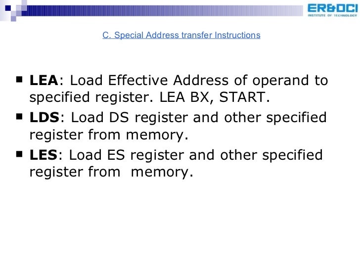 43. 46. <ul><li>LEA : Load Effective Address of operand to specified register. LEA BX, START. </li></ul><ul><li>LDS : Load DS register and other specified register from memory. </li></ul><ul><li>LES : Load ES register and other specified register from memory. </li></ul>C. Special Address transfer Instructions