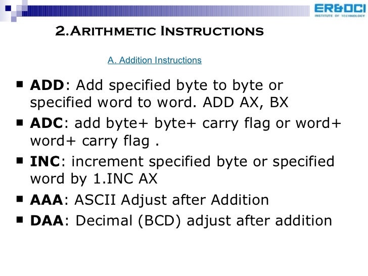 45. 48. 2.Arithmetic Instructions <ul><li>ADD : Add specified byte to byte or specified word to word. ADD AX, BX </li></ul><ul><li>ADC : add byte+ byte+ carry flag or word+ word+ carry flag . </li></ul><ul><li>INC : increment specified byte or specified word by 1.INC AX </li></ul><ul><li>AAA : ASCII Adjust after Addition </li></ul><ul><li>DAA : Decimal (BCD) adjust after addition </li></ul>A. Addition Instructions