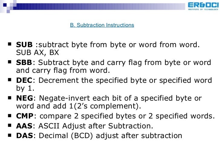 46. 49. <ul><li>SUB :subtract byte from byte or word from word. SUB AX, BX </li></ul><ul><li>SBB : Subtract byte and carry flag from byte or word and carry flag from word. </li></ul><ul><li>DEC : Decrement the specified byte or specified word by 1. </li></ul><ul><li>NEG : Negate-invert each bit of a specified byte or word and add 1(2’s complement). </li></ul><ul><li>CMP : compare 2 specified bytes or 2 specified words. </li></ul><ul><li>AAS : ASCII Adjust after Subtraction. </li></ul><ul><li>DAS : Decimal (BCD) adjust after subtraction </li></ul>B. Subtraction Instructions