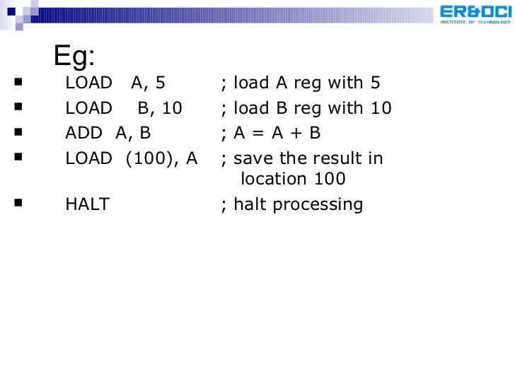 5. 5. Eg: <ul><li>LOAD A, 5 ; load A reg with 5 </li></ul><ul><li>LOAD B, 10 ; load B reg with 10 </li></ul><ul><li>ADD A, B ; A = A + B </li></ul><ul><li>LOAD (100), A ; save the result in location 100 </li></ul><ul><li>HALT ; halt processing </li></ul>