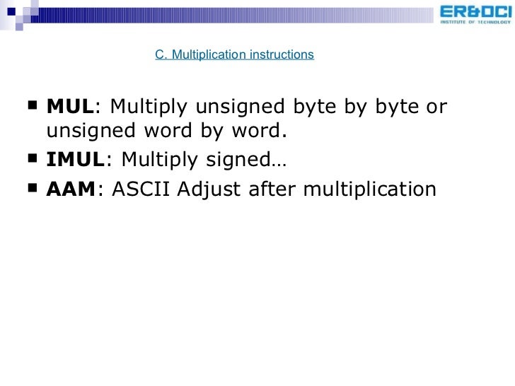 47. 50. <ul><li>MUL : Multiply unsigned byte by byte or unsigned word by word. </li></ul><ul><li>IMUL : Multiply signed… </li></ul><ul><li>AAM : ASCII Adjust after multiplication </li></ul>C. Multiplication instructions
