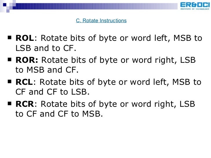 51. 54. <ul><li>ROL : Rotate bits of byte or word left, MSB to LSB and to CF. </li></ul><ul><li>ROR: Rotate bits of byte or word right, LSB to MSB and CF. </li></ul><ul><li>RCL : Rotate bits of byte or word left, MSB to CF and CF to LSB. </li></ul><ul><li>RCR : Rotate bits of byte or word right, LSB to CF and CF to MSB. </li></ul>C. Rotate Instructions