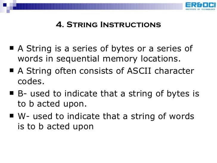 52. 55. 4. String Instructions <ul><li>A String is a series of bytes or a series of words in sequential memory locations. </li></ul><ul><li>A String often consists of ASCII character codes. </li></ul><ul><li>B- used to indicate that a string of bytes is to b acted upon. </li></ul><ul><li>W- used to indicate that a string of words is to b acted upon </li></ul>