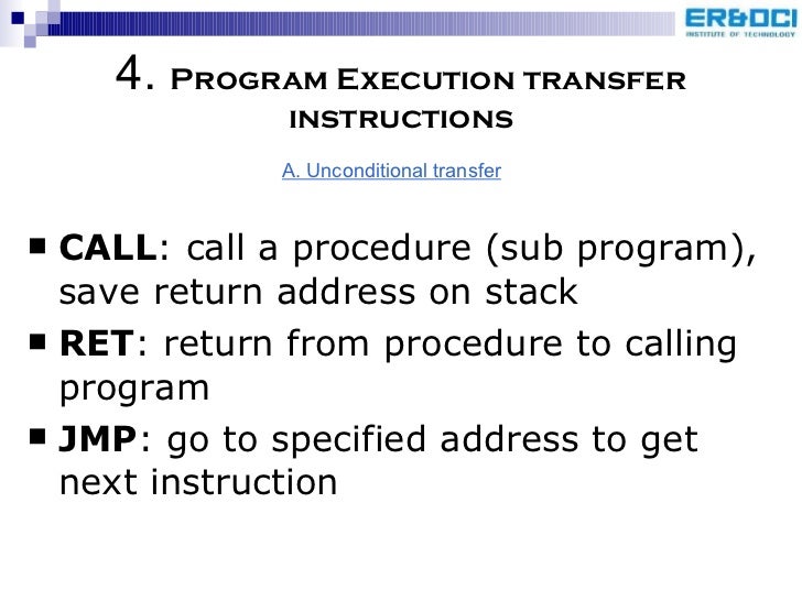 55. 58. <ul><li>CALL : call a procedure (sub program), save return address on stack </li></ul><ul><li>RET : return from procedure to calling program </li></ul><ul><li>JMP : go to specified address to get next instruction </li></ul>4. Program Execution transfer instructions A. Unconditional transfer