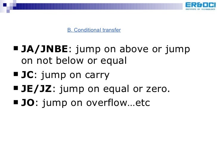 56. 59. <ul><li>JA/JNBE : jump on above or jump on not below or equal </li></ul><ul><li>JC : jump on carry </li></ul><ul><li>JE/JZ : jump on equal or zero. </li></ul><ul><li>JO : jump on overflow…etc </li></ul>B. Conditional transfer