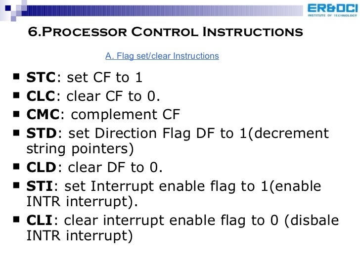 59. 62. 6.Processor Control Instructions <ul><li>STC : set CF to 1 </li></ul><ul><li>CLC : clear CF to 0. </li></ul><ul><li>CMC : complement CF </li></ul><ul><li>STD : set Direction Flag DF to 1(decrement string pointers) </li></ul><ul><li>CLD : clear DF to 0. </li></ul><ul><li>STI : set Interrupt enable flag to 1(enable INTR interrupt). </li></ul><ul><li>CLI : clear interrupt enable flag to 0 (disbale INTR interrupt) </li></ul>A. Flag set/clear Instructions