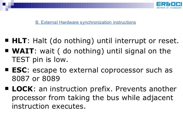 60. 63. <ul><li>HLT : Halt (do nothing) until interrupt or reset. </li></ul><ul><li>WAIT : wait ( do nothing) until signal on the TEST pin is low. </li></ul><ul><li>ESC : escape to external coprocessor such as 8087 or 8089 </li></ul><ul><li>LOCK : an instruction prefix. Prevents another processor from taking the bus while adjacent instruction executes. </li></ul>B. External Hardware synchronization instructions