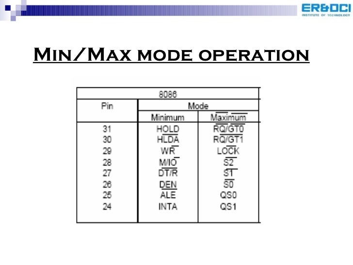 65. 68. <ul><li>The pins that are available exclusively in the minimum mode are ( bold indicates active low ) </li></ul><ul><li>24-Interrupt Acknowledge – INTA- is a response to the INTR pin. </li></ul><ul><li>25-Address Latch Enable – ALE - indicates the 8086 adrs/data bus contains adrs infrmn. </li></ul><ul><li>26-Data Enable - DEN –external data bus buffers </li></ul><ul><li>27-Data Transmit/Receive - DT/ R- shows processors data bus is txing or rxing. </li></ul><ul><li>28-Status Line - M/ IO -selects memory or I/O </li></ul><ul><li>29-Write – WR- indicates that the 8086 is outputting data to memory or I/O devices. </li></ul><ul><li>30-Hold Acknowledge – HLDA-indicates the processor entered in a HOLD state </li></ul><ul><li>31-Hold – HOLD-it requests a DMA. </li></ul>