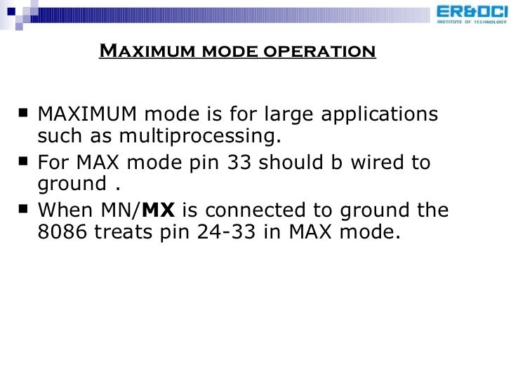 66. 69. <ul><li>MAXIMUM mode is for large applications such as multiprocessing. </li></ul><ul><li>For MAX mode pin 33 should b wired to ground . </li></ul><ul><li>When MN/ MX is connected to ground the 8086 treats pin 24-33 in MAX mode. </li></ul>Maximum mode operation